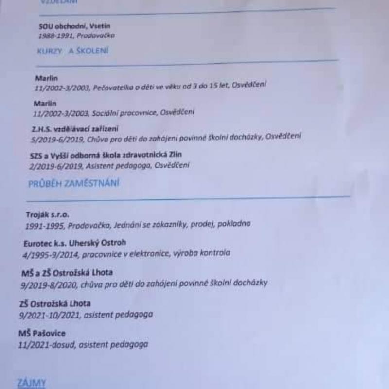 | Co umím a co mě baví: | Hledám od 1.9. 2023 .. práci. Asistent Pedagoga v MŠ nebo ... Chůva do zahájení povinné školní docházky. Praxi mám. Uz několik let s malými dětmi v několika MŠ. Uherské Hradiště a okolí Zlín a okolí Veselí nad Moravou a okolí.. Přerušena střední škola. Osvědčení asistent Pedagoga, chůva do zahájení povinné školní docházky. |